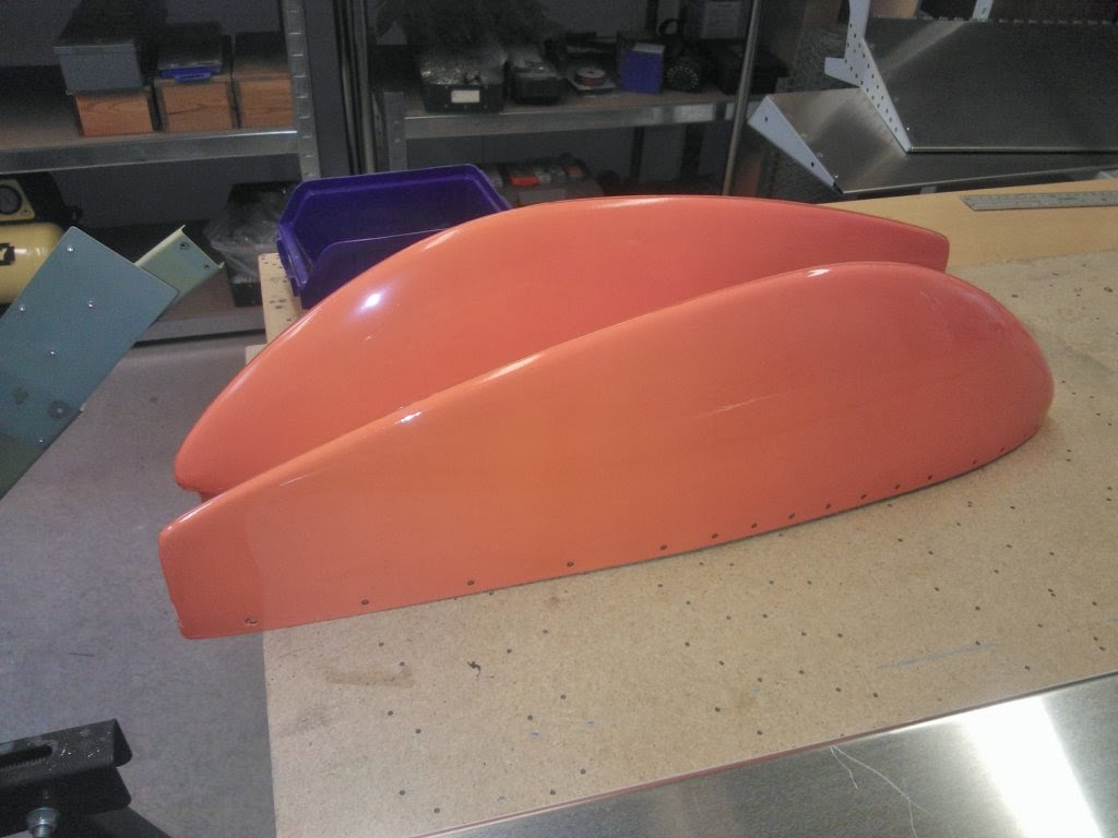 Changed the color from dark green to bright orange. Dark green is nice, but it's so dark that it only looks good in sun shine. Here in Stjørdal the sun is not something that is shining all too often, and then the airplane will look too dull and dark. With orange tips and cowling, the airplane will look similar in color to the picture of the Trial further down (or ordinary Sonex polished style with orange instead of yellow). I think that will look cool, also on rainy days.